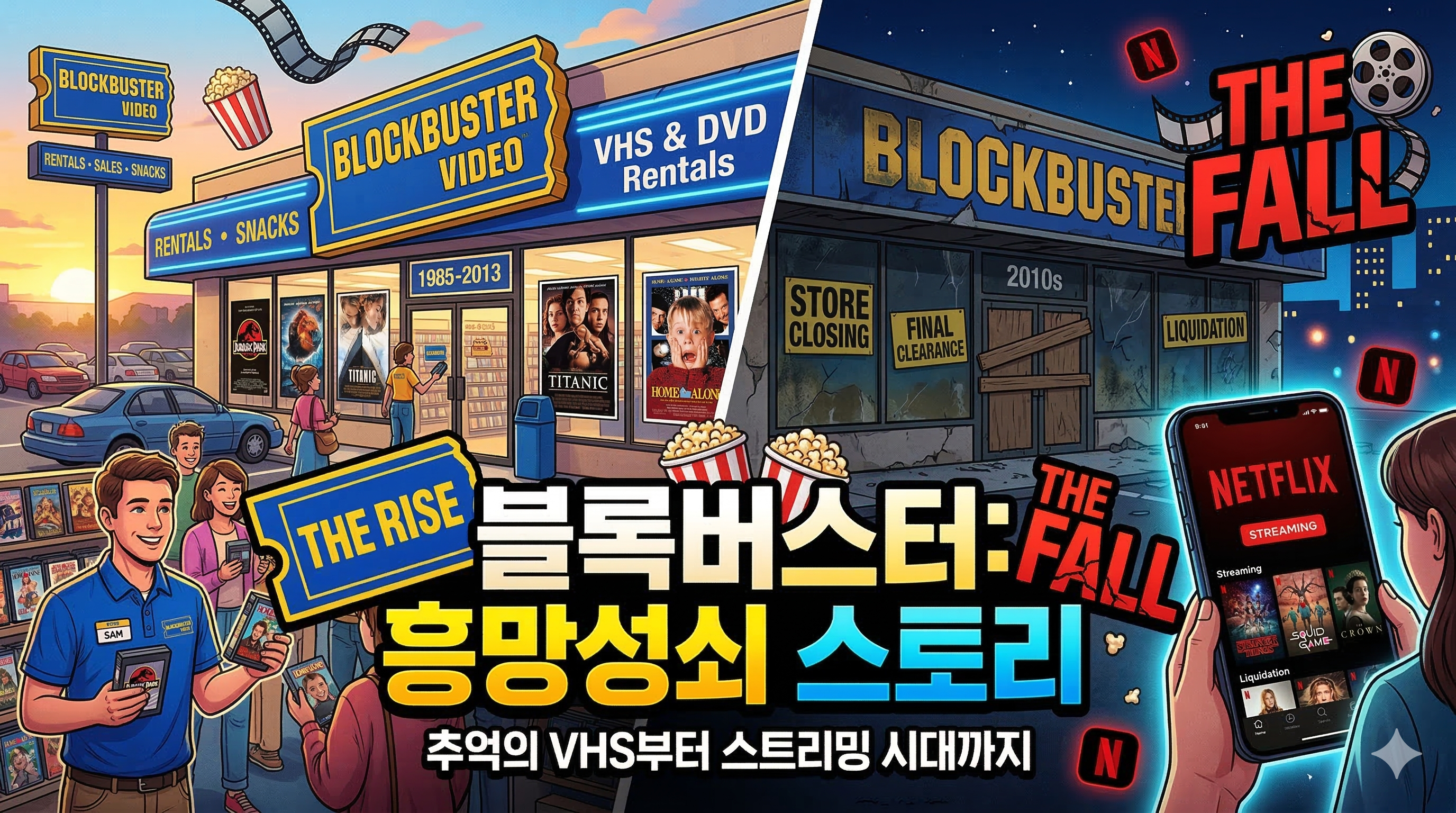 오늘은 한때 전 세계 비디오 대여 시장을 주름잡았던 파란색과 노란색의 상징, **'블록버스터(Blockbuster)'**의 흥망성쇠 이야기를 들려드리겠습니다.